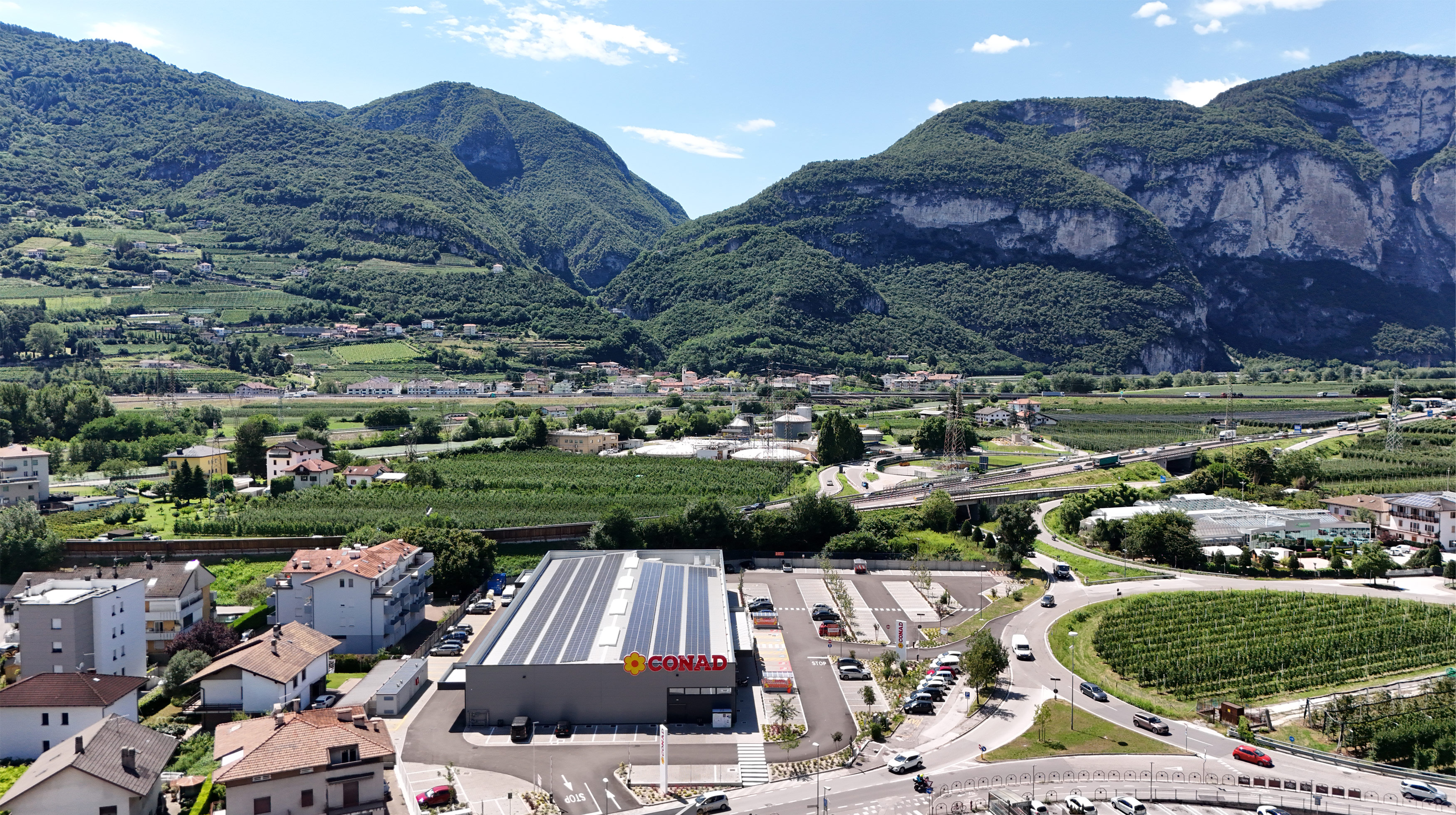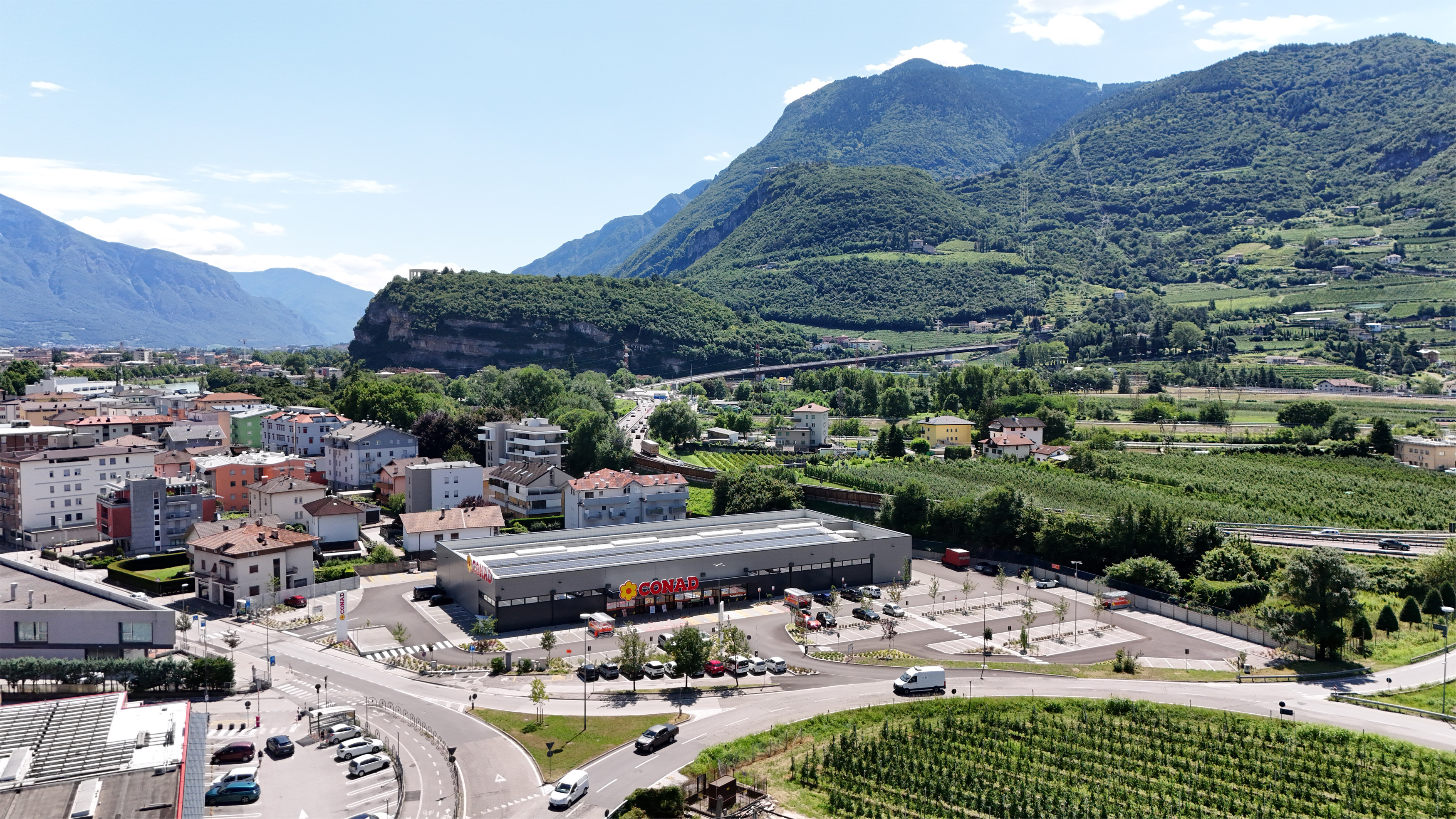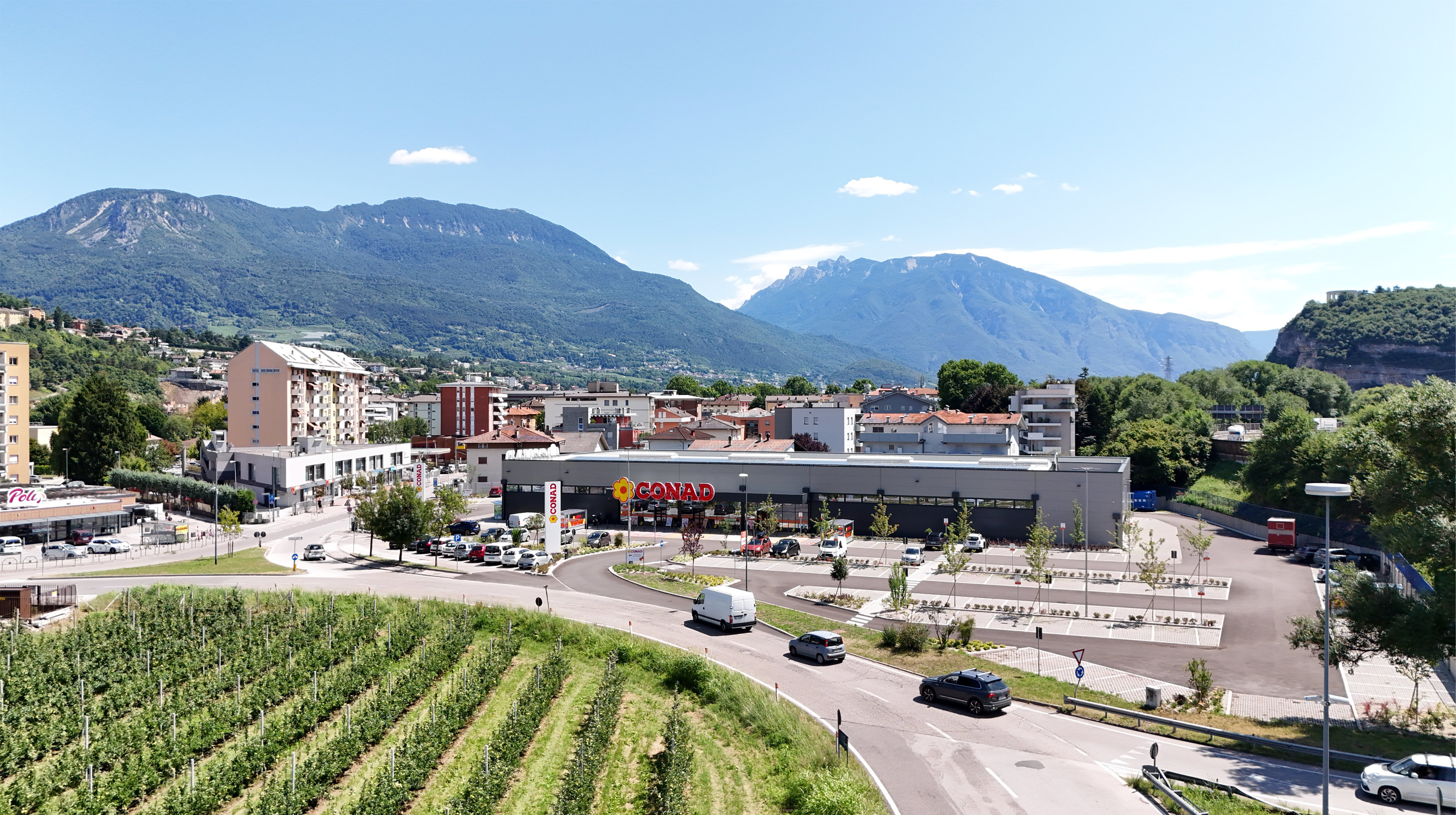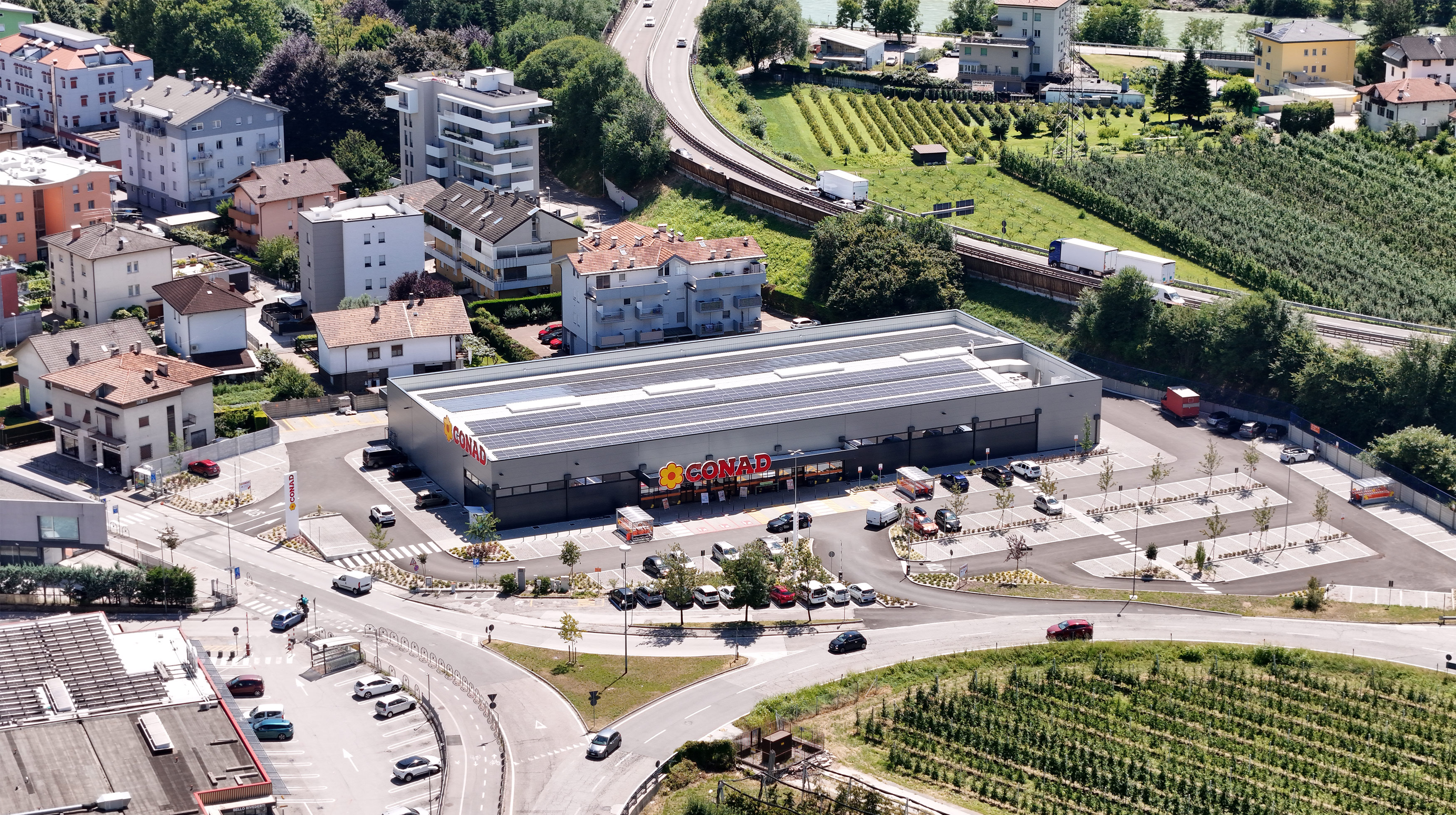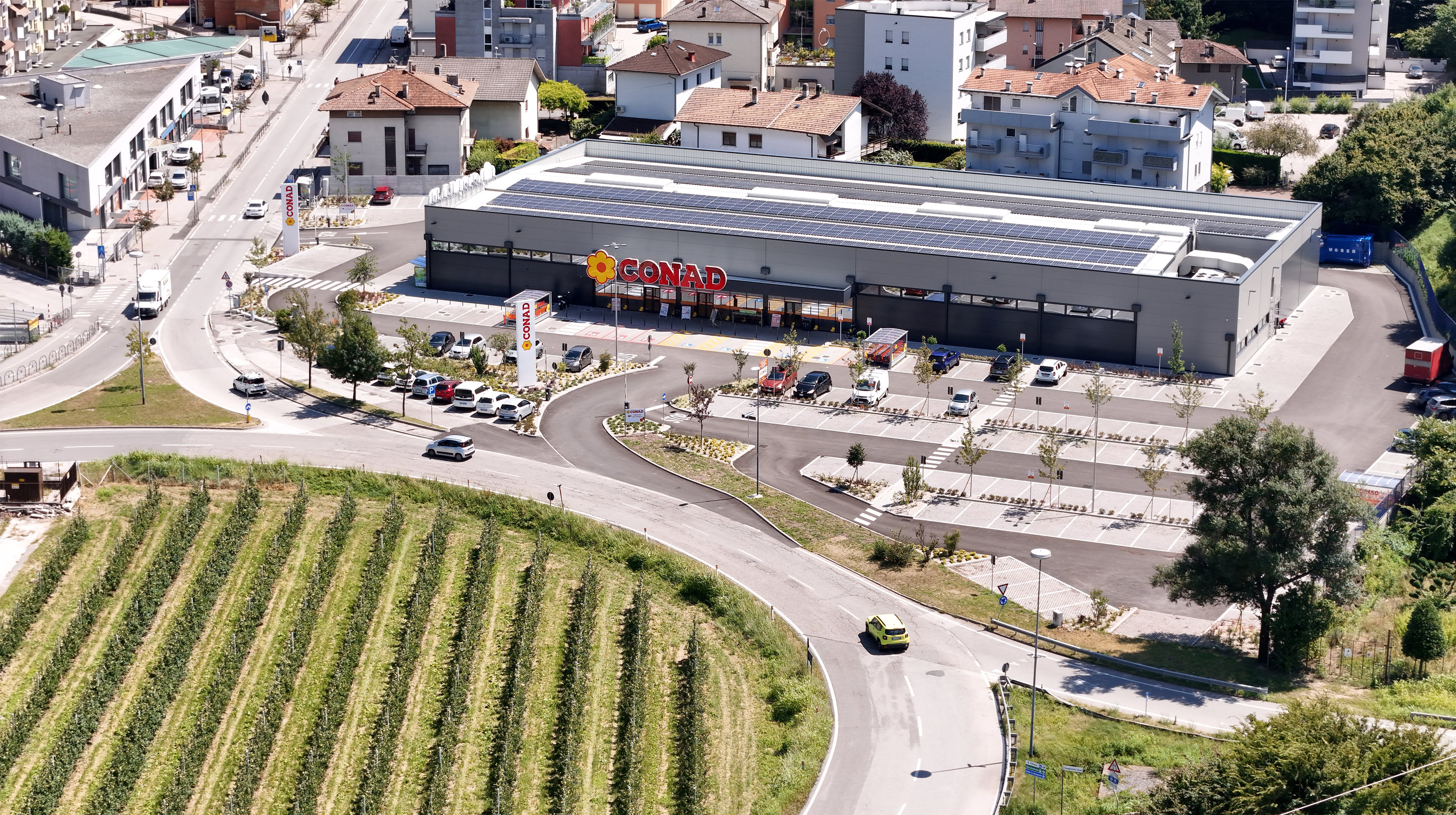 Conad di Gruppo DAO ci ha scelti per la realizzazione di 1500 metri quadri di negozio, situato a Nord del centro di Trento. 2400 metri quadri di piastra su un lotto di 8500 metri quadri, interamente costruito in legno lamellare e Xlam, con l’utilizzo di pannelli sandwich in lana di roccia e serramenti in alluminio a taglio termico.